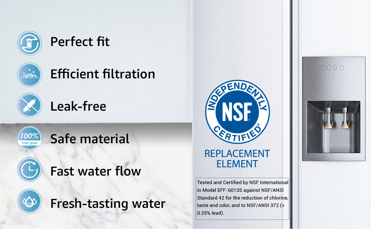 The Filterlogic refrigerator water filter is certified by NSF 42 and 372 standards. The innovative design and advanced materials reduce many harmful substances from your water source, leaving you with healthier water and a cleaner, fresher taste.Premium filter material: Here at Filterlogic, we adopt 100% natural coconut shell carbon block containing twice the surface area and more micropores than an inferior carbon block.