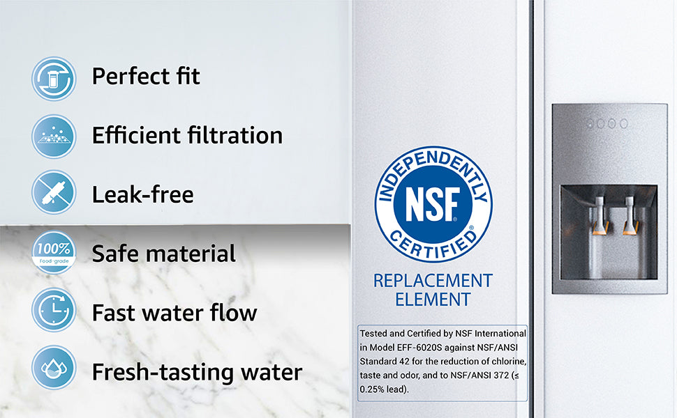 The Filterlogic refrigerator water filter is certified by NSF 42 and 372 standards. The innovative design and advanced materials reduce many harmful substances from your water source, leaving you with healthier water and a cleaner, fresher taste.Premium filter material: Here at Filterlogic, we adopt 100% natural coconut shell carbon block containing twice the surface area and more micropores than an inferior carbon block.